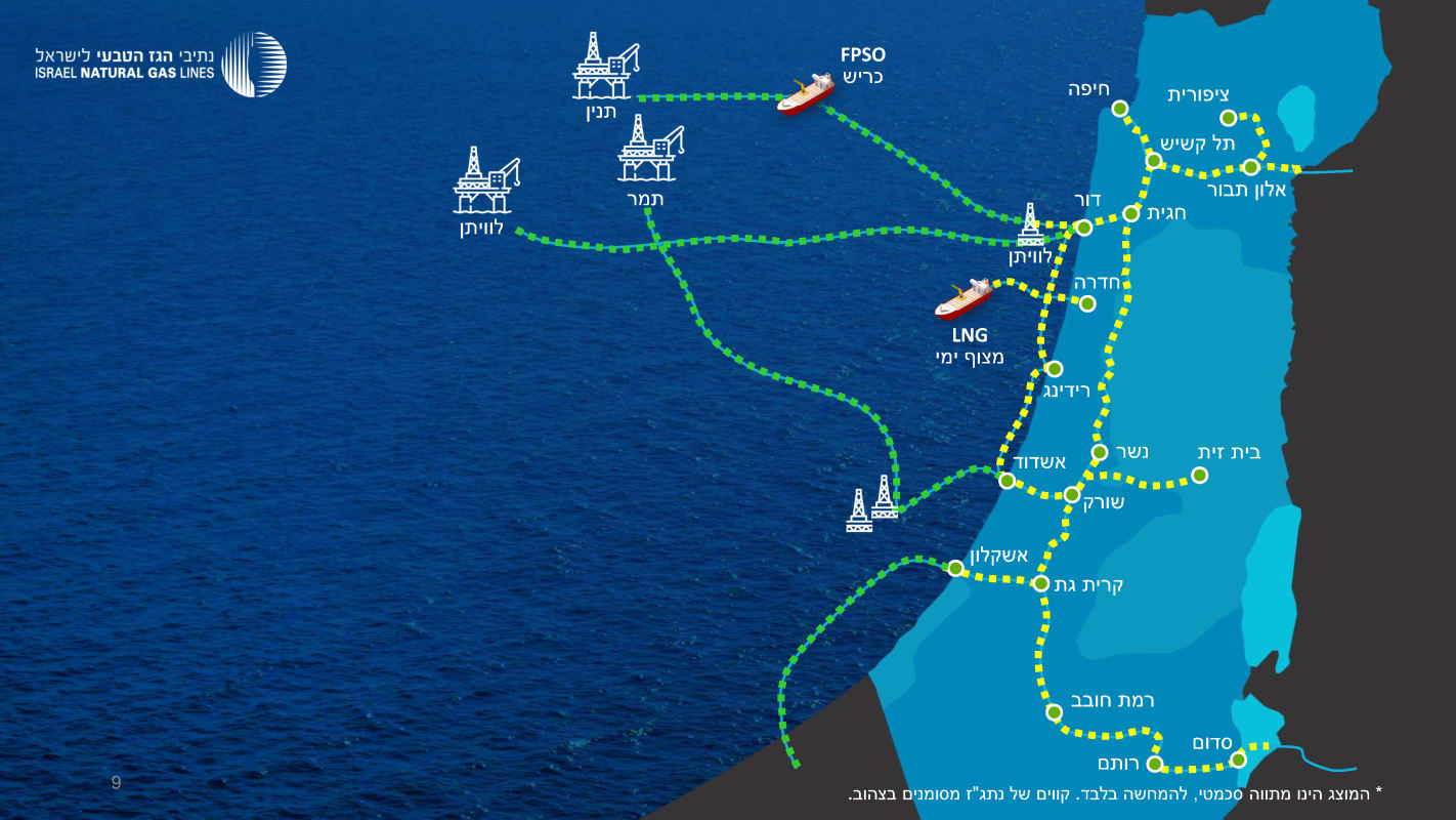 A deep water LNG receiving terminal and monitoring system to receive natural gas from floating storage and regasification vessels, located approximately 10 kilometers west of Hadera’s coastline (in operation since January 2013), and connected through an offshore line to the national transmission system.